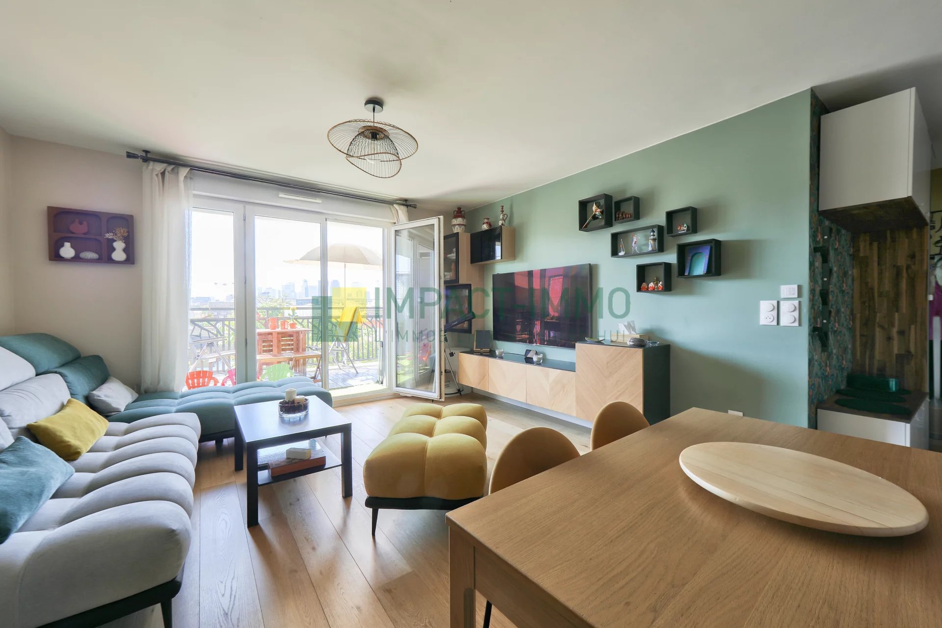 Dès l’entrée, on découvre une distribution fluide et agréable. Le séjour, spacieux (plus de 24 m²), accueille une cuisine américaine aménagée et équipée, le tout ouvrant sur une magnifique terrasse exposée plein sud. Baignée de soleil, cette terrasse bénéficie d’une vue dégagée sur les toits de Colombes, jusqu’à la skyline de La Défense et Paris, sans aucun vis-à-vis.